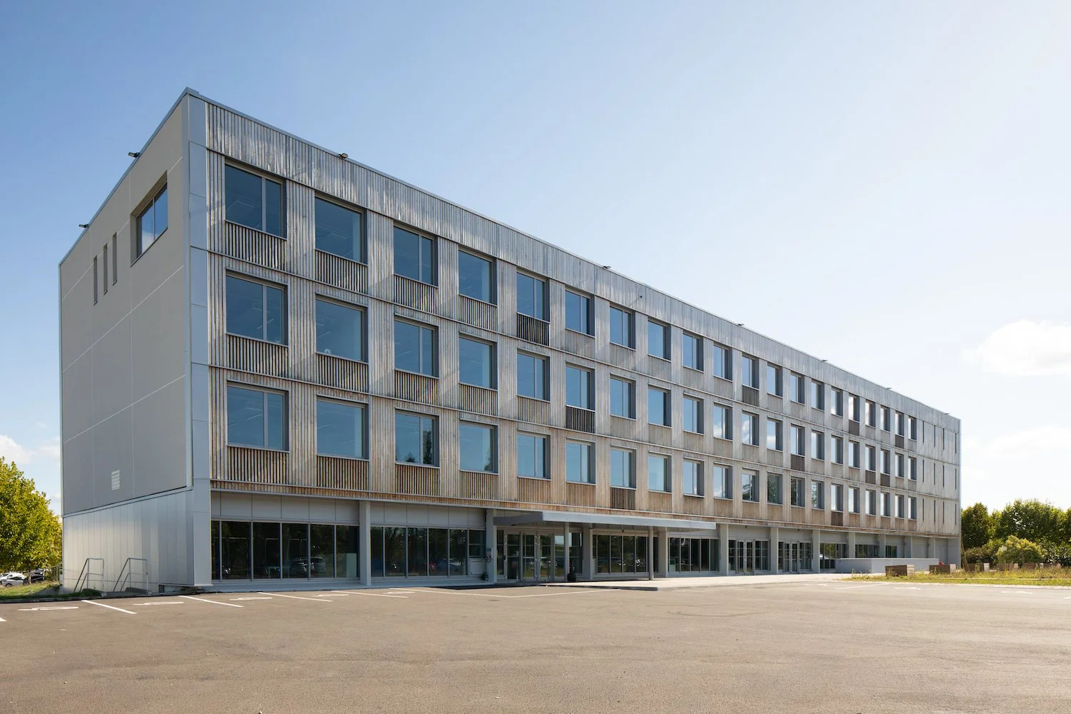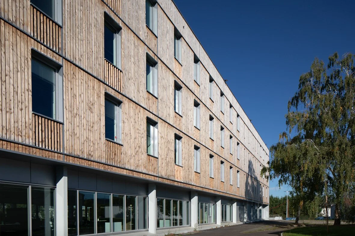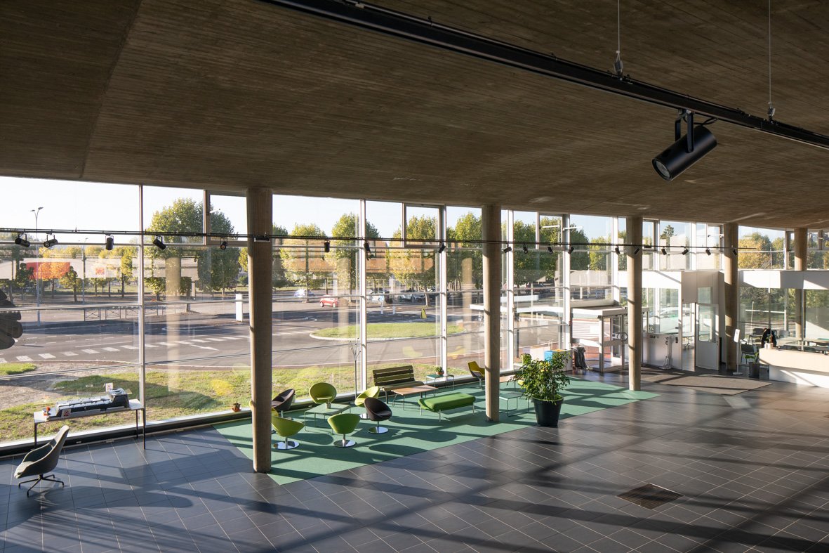 C’est la réhabilitation du bâtiment X de l’usine Renault à Flins, de l’architecte Bernard Zerfuss, en un laboratoire de recherche sur les mobilités du futur. Un travail sur de nouvelles menuiseries, un travail sur l’habillage, autant de points d’entrée pour souligner et mettre en valeur la trame existante remarquable. Entre une économie de moyen et un état d’esprit brut, les murs dépouillés et laissés intacts rappellent une histoire et créent un décor sobre et assumé. La brutalité devient cadre , support et rappelle une idée de « vrai ».